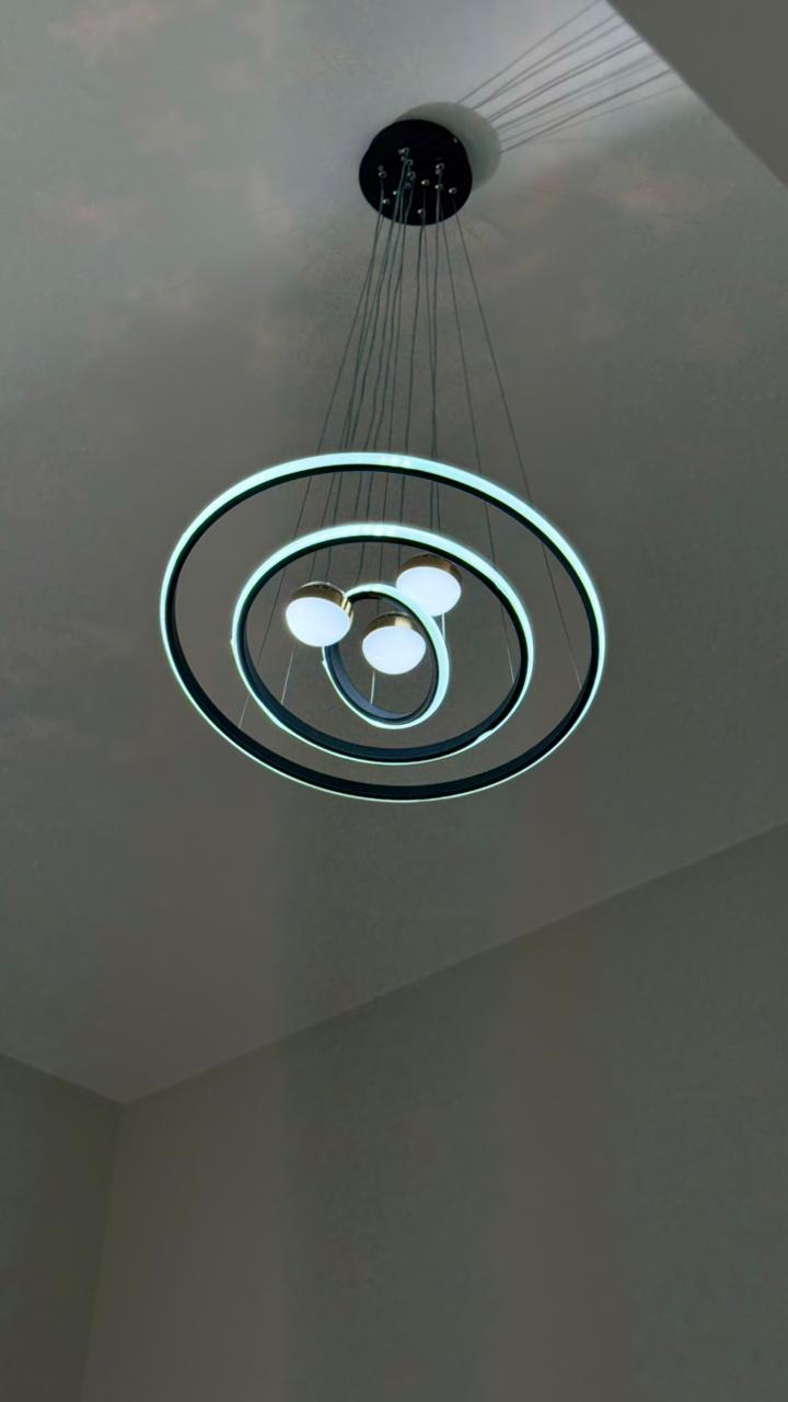 Ao entrar, o ambiente revela um projeto pensado para o bem-estar da família. A sala é elegante e aconchegante, com um lustre que valoriza ainda mais o espaço e traz um toque de sofisticação ao ambiente.